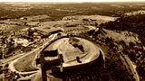 Aerial historical castle slope surrounded by round stone wall. Arraiolos village
