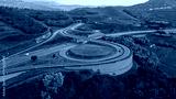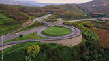 Drone road junction mountainous area. Cars moving asphalt highway on slopes