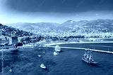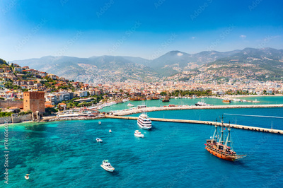 Aerial drone view of beautiful harbor with ships and boats and Kizil Kule Red tower in Alanya, Turkey. Summer sunny day