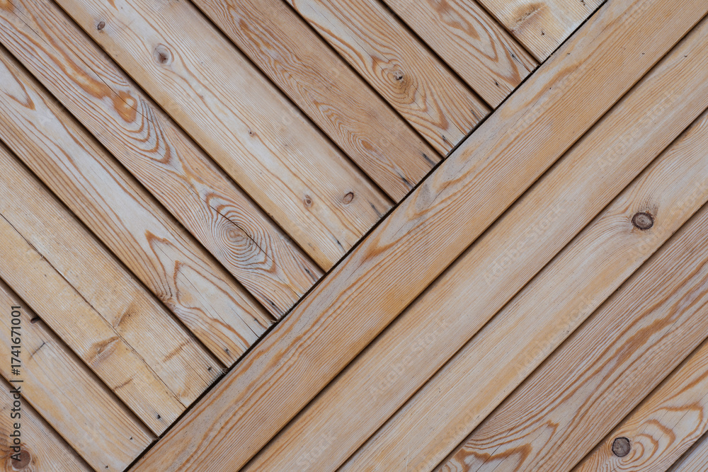 Natural wooden background with diagonal pine planks, rustic table texture for design, product mockups and interiors.