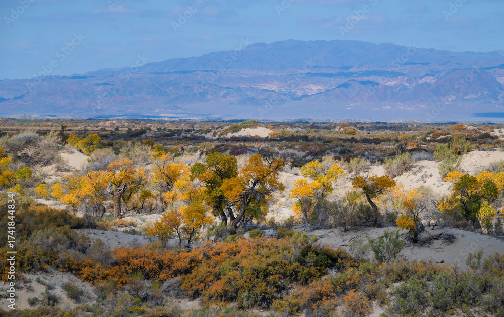 An aerial view of a sandy area with Turanga (poplar) trees in the Almaty region of southeastern Kazakhstan on a cloudy autumn morning.