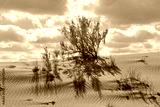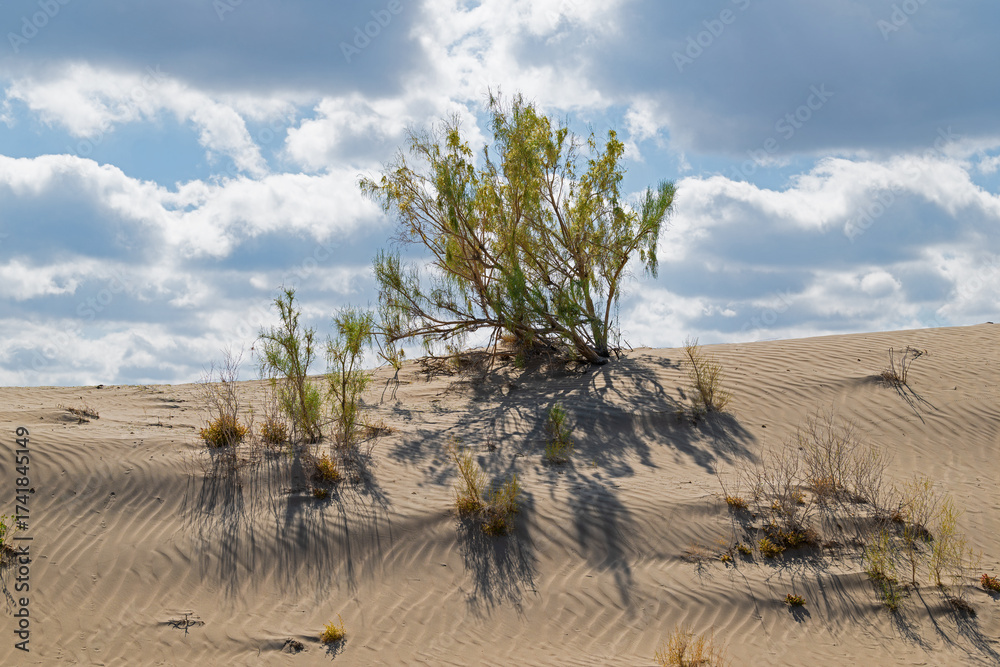A sand dune and cloudy sky in the desert area of Almaty region in southeastern Kazakhstan.