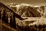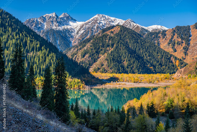 Aerial view of picturesque Lake Issyk in the Trans-Ili Alatau Mountains in southeastern Kazakhstan on an autumn morning