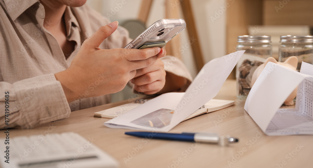 Close-up of person scanning receipts with smartphone at desk, showing financial documents, accounting records, and expense tracking for budget planning, reimbursement, and digital bookkeeping.
