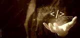 Close-up of a hand with a floating HTML code symbol and digital programming lines, representing software development, coding, web engineering, and innovative technology solutions.