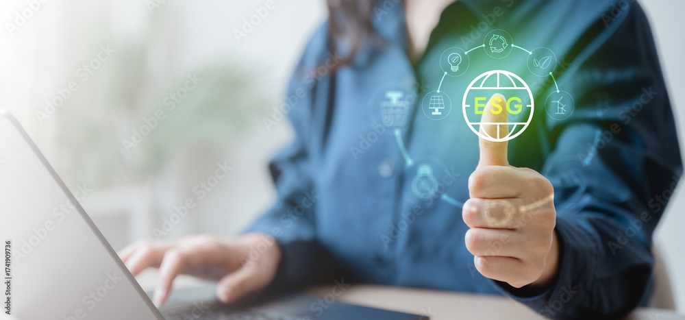 Thumbs up with ESG icon and eco-related symbols, representing sustainability, carbon footprint reduction, green energy, and corporate responsibility for climate change action.