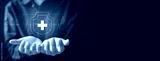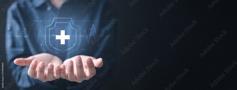 Open hands holding a glowing digital health shield icon, representing medical insurance, healthcare coverage, wellness protection, and financial security in modern healthcare services.