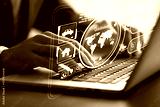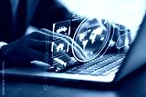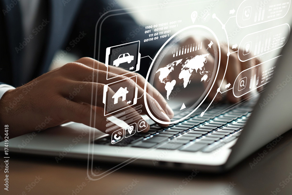Modern Businessman Working on Laptop with Innovative Technology and Digital Interface Displaying Data, Icons, and Global Connectivity