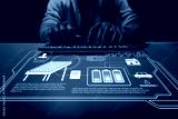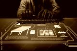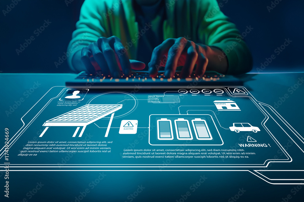 Hands typing on a keyboard with futuristic graphics about solar panels, batteries, and electric vehicles, conveying a high-tech energy concept