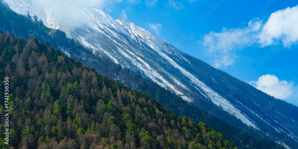 Snow fall mountain with blue sky and clouds. Panoramic view during sunset over snow, Panorama of winter mountains Concept of natural beauty and majestic landscapes nature Snow-covered mountains.