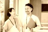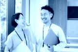 緑のある窓際で話す名札を付けた笑顔の男女のパソコンを持つ爽やか、話すオフィスカジュアルミドルビジネスマン コミニケーションや心理的安全などのイメージ