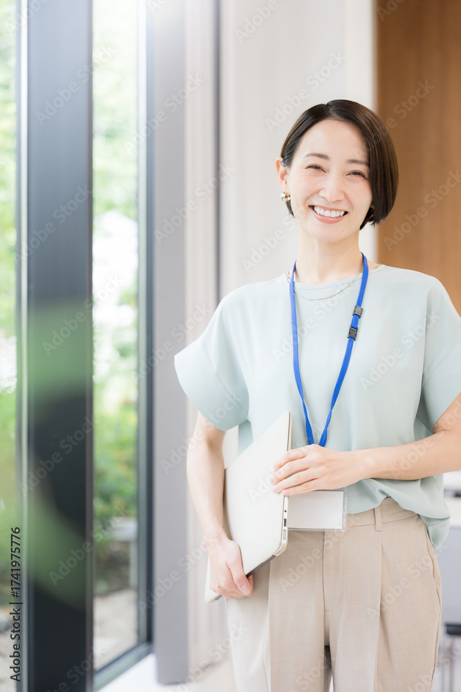 Office-casual career women and working mothers holding laptops by the window, looking directly at the camera. Vertical.