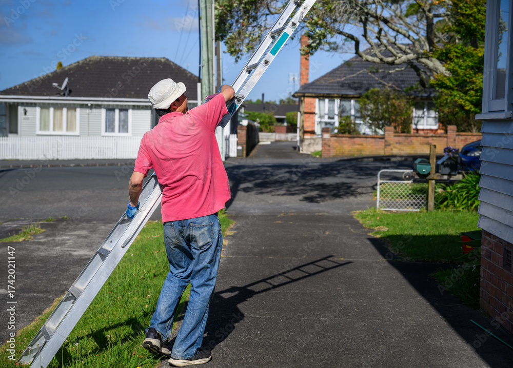 Man putting a ladder on the wall of the house. Home maintenance work. Auckland.