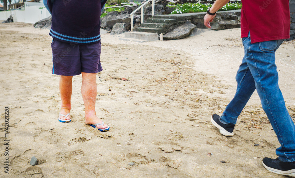 Man with swollen feet walking on the sandy beach. Living with diabetes.