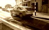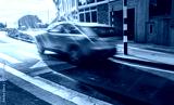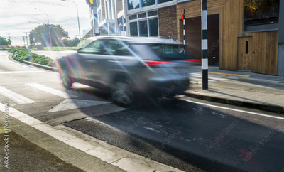 A car driving over raised speed bump and pedestrian crossing. Auckland.