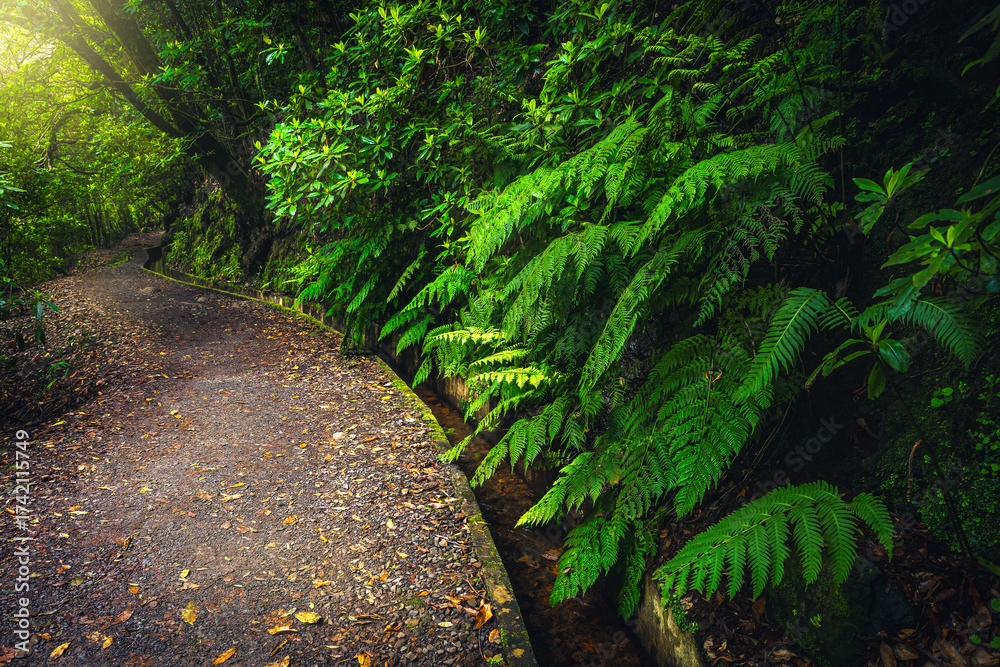 Fantastic levada hiking trail near water canal, Madeira Island, Portugal