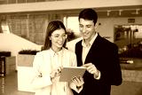 Two happy young Hispanic business partners working together
