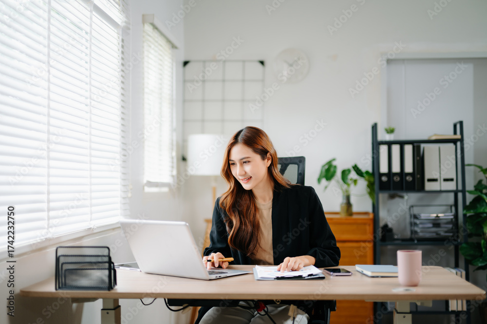 Business woman using tablet and laptop for doing math finance on an office desk, tax, report, accounting, statistics, and analytical research concept in office