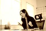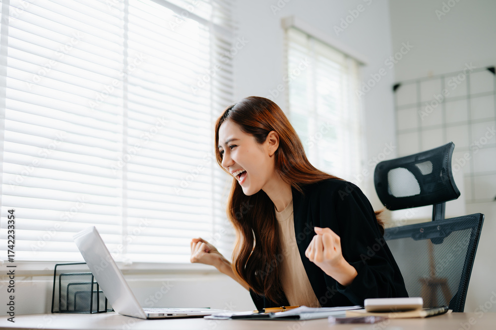 Asian businesswoman celebrating success in modern office, holding tablet and smiling with laptop, showing joy and achievement in work, startup, and digital business.
