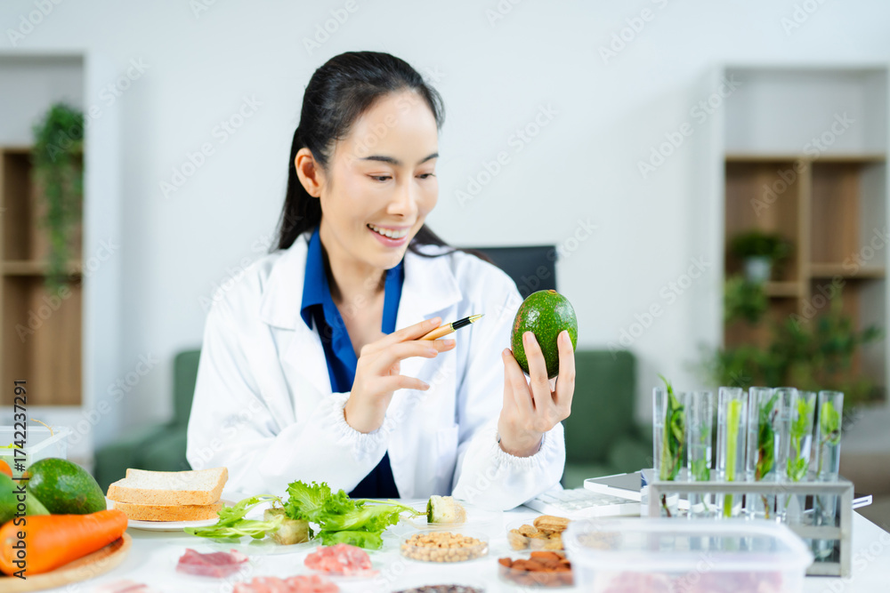 Female scientist in lab coat holding avocado while analyzing healthy ingredients. Nutrition science, food safety, and clean eating research concept.