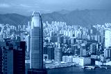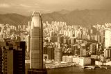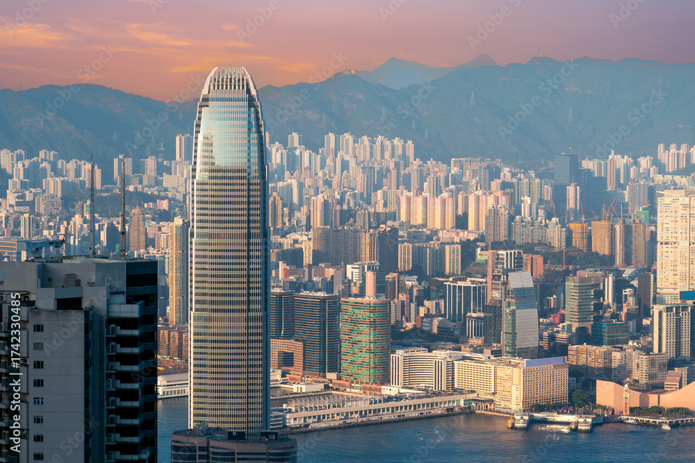 Aerial evening sunset view of the city and the bay in the valley, urban strait, urban modern landscape