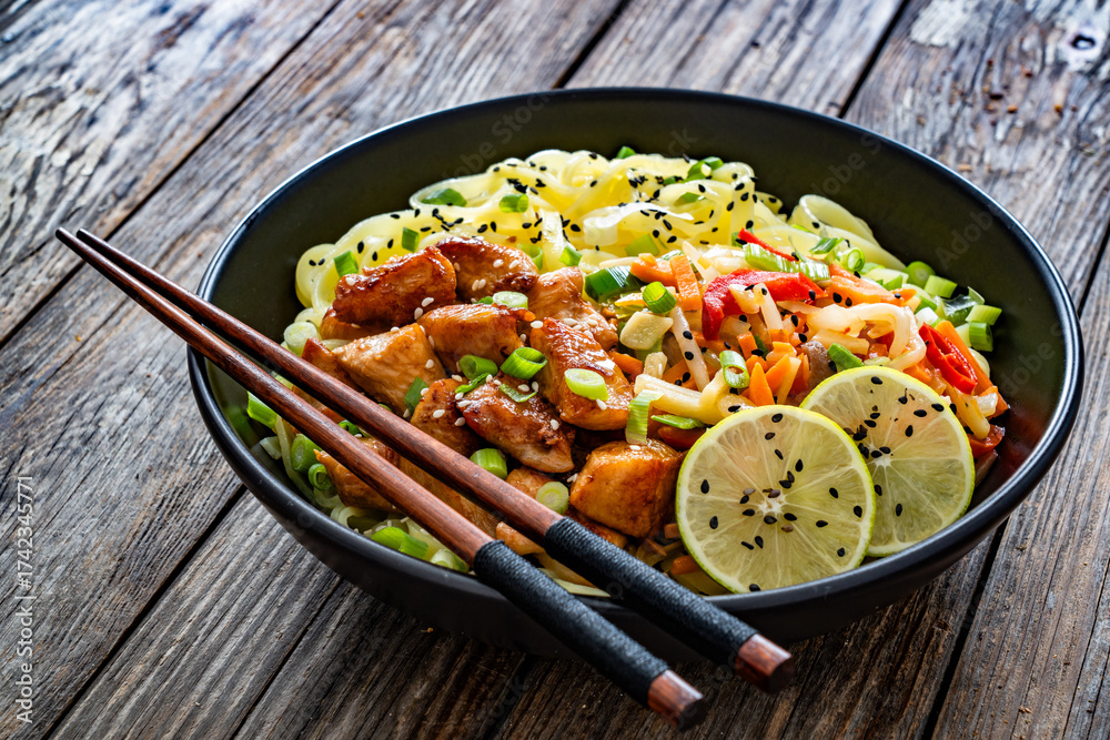 Asian food - chicken nuggets, rice noodles and stir fried vegetables on wooden table