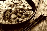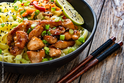 Asian food - chicken nuggets, rice noodles and stir fried vegetables on wooden table