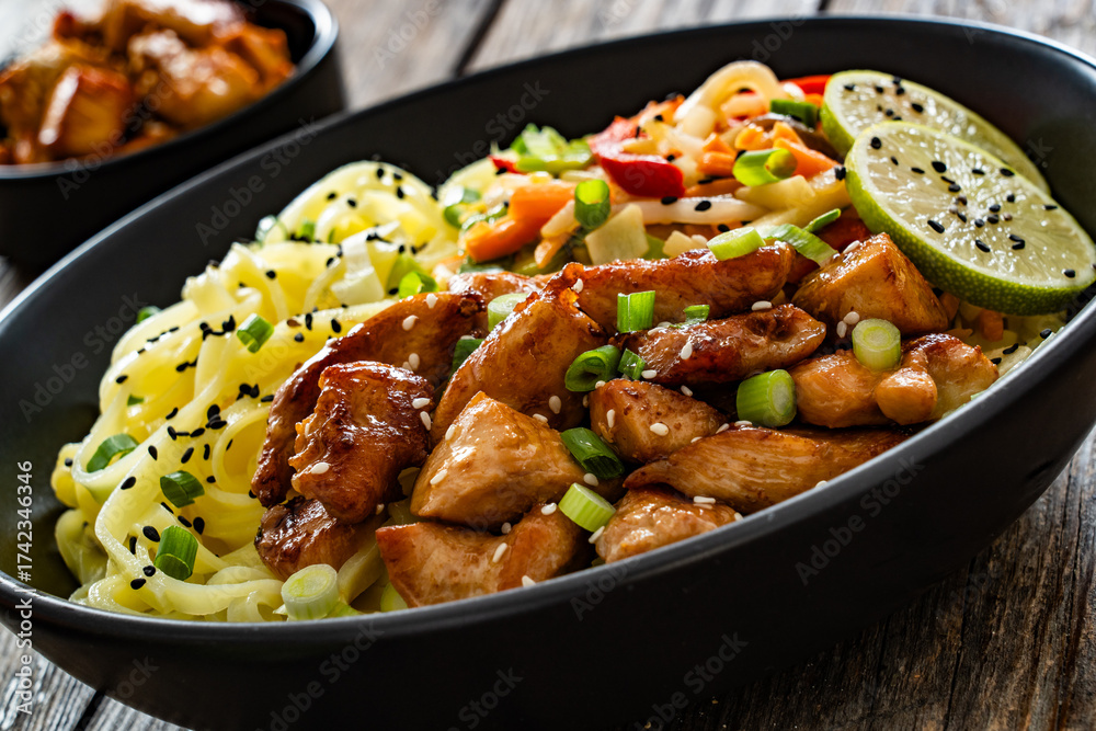 Asian food - chicken nuggets, rice noodles and stir fried vegetables on wooden table