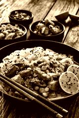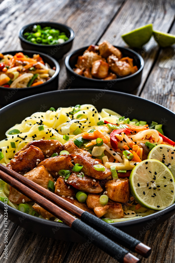 Asian food - chicken nuggets, rice noodles and stir fried vegetables on wooden table