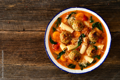 Creamy Italian Meatballs Wedding Soup on wooden table. Top view