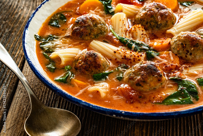 Creamy Italian Meatballs Wedding Soup on wooden table