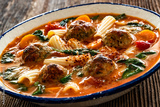 Creamy Italian Meatballs Wedding Soup on wooden table