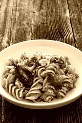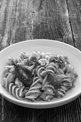 Creamy tomato and stracciatella fusillioni noodles on wooden table
