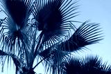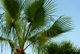 Palm fronds against a clear blue sky, vibrant green leaves, sunny day, closeup of palm tree, tropical, vibrant green, natural light, sunny day, detailed leaves, summer vibes, peaceful, serene