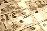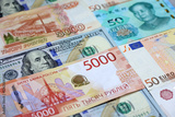 US dollars, Chinese yuan, Euro banknotes and Russian rubles. Concept of american and european sanctions against Russia