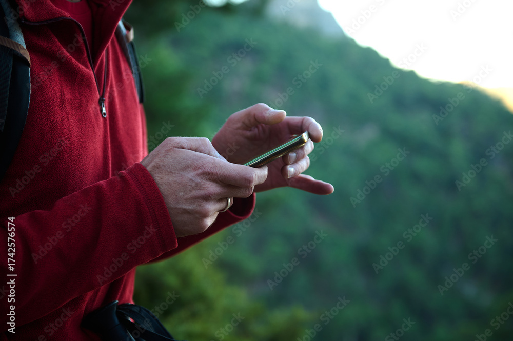 Person In Red Jacket Using Smartphone Outdoors On Scenic Hiking Trail