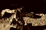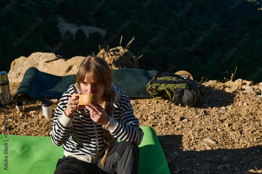 A woman sits on a green mat at a rocky mountaintop, sipping a warm drink with camping gear nearby, capturing a peaceful outdoor moment.