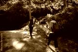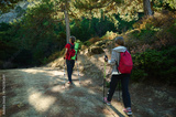 Two hikers with backpacks and trekking poles walk along a sunlit forest path, surrounded by trees and shrubs, capturing a peaceful outdoor adventure and friendship in nature.