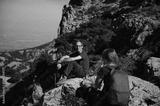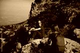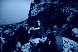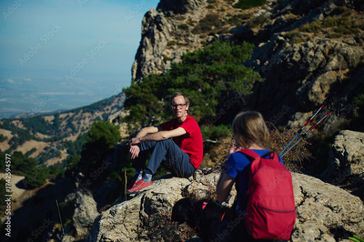 Two hikers pause on a rocky mountain ridge, enjoying the view as one sits in a red shirt and the other carries a red backpack. Outdoor adventure and fitness.