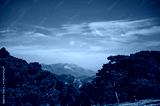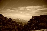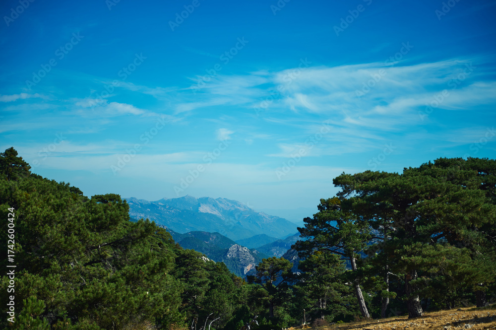 Expansive mountain range visible beyond a dense pine forest under bright blue skies, a serene natural landscape perfect for travel, nature, and outdoor lifestyle visuals.