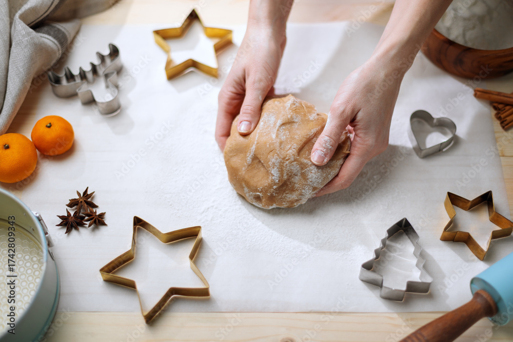 Overhead view of a person kneading gingerbread dough, surrounded by festive cutters and spices.