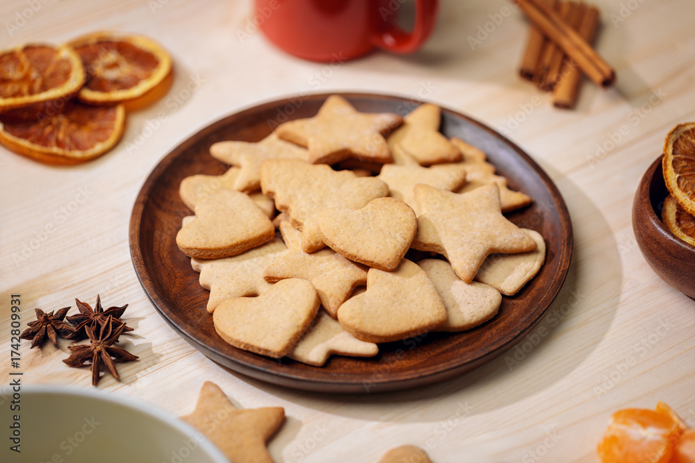 Wooden plate piled with star and heart-shaped cookies surrounded by oranges, star anise, and cinnamon.