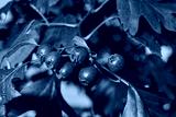 Ripe hawthorn fruits hanging on a branch among dense foliage. Natural seasonal background for health and nature illustrations. Macrophotography of hawthorn fruits on a background of green leaves.