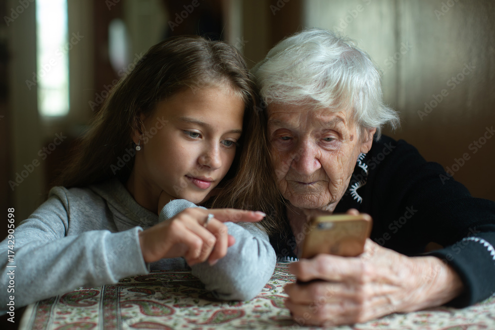 A teengirl teaches her grandmother how to use a smartphone. The warm moment shows care, connection, and the bridge between generations through technology.