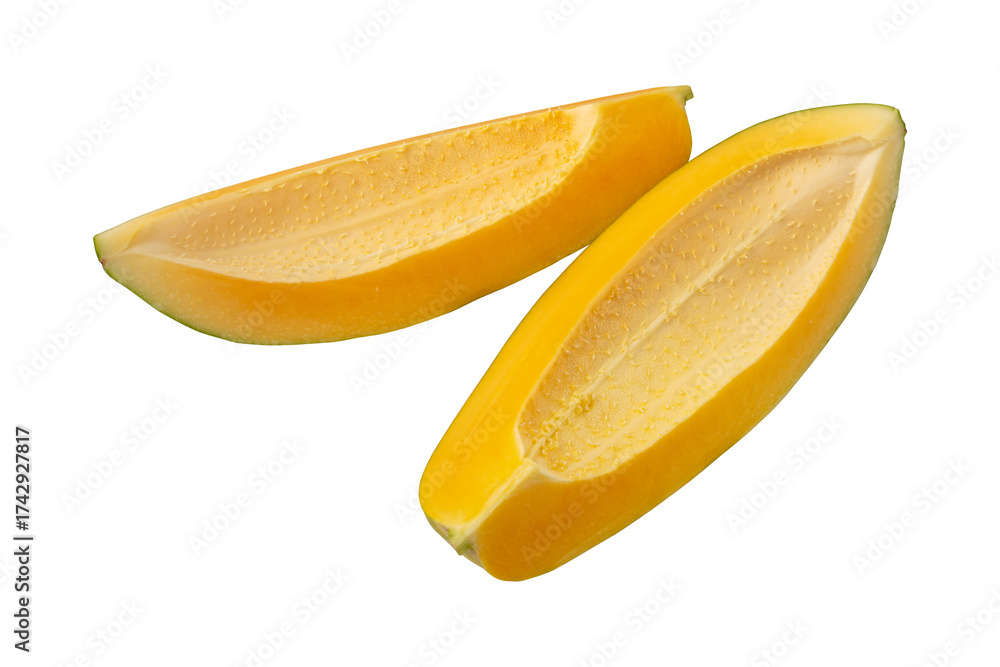 Fresh ripe yellow papaya fruit slices isolated on transparent background