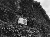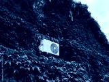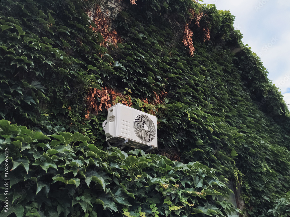 External white air conditioner unit on the wall among green leaves of wild grapes. Private house and modern equipment for microclimate.