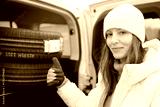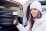 Happy woman loads new tires into her car trunk for seasonal tire change in winter. purchase and sale of new tires for the season.
