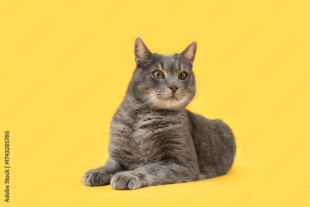 Cute grey cat lying on yellow background
