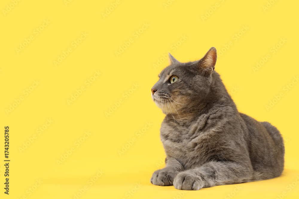 Cute grey cat lying on yellow background
