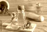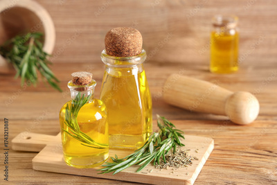 Bottles of rosemary cosmetic oil on wooden background, closeup
